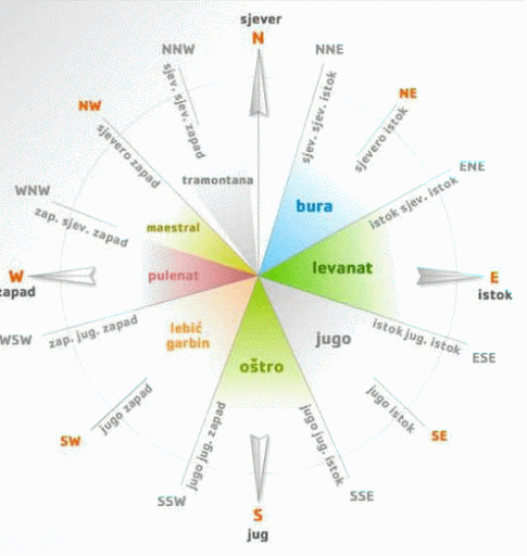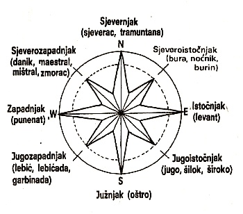 Razvedenost obale, prekrasni otoci, čisto more i obilje sunčanih dana čini hrvatsku obalu Jadrana među najljepšima na Sredozemlju. Uz sve to, ovo se područje može “pohvaliti” i vrlo raznolikom i bogatom ružom vjetrova. Što nazivamo ružom vjetrova? Grafički i dijagramski prikaz smjera, intenziteta i brzine vjetra za određeno područje. Tako razlikujemo romansku ružu vjetrova od osam smjerova i germansku koja određuje čak šesnaest pravaca.