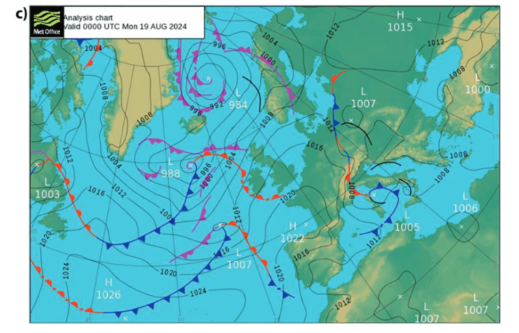 Analiza satelitskih podataka pokazala je da se između 20:00 UTC 18. kolovoza i 04:00 UTC 19. kolovoza nad južnim Tirenskim morem razvio mezo-konvektivni sustav (MCS). Satelitske snimke u infracrvenom spektru jasno pokazuju da je ovaj sustav sadržavao konvektivne ćelije s relativno kratkim životnim vijekom – najniža temperatura vrha oblaka od oko 210 K (-63°C) zabilježena je u 01:57 UTC, što ukazuje na vrlo aktivnu konvekciju.