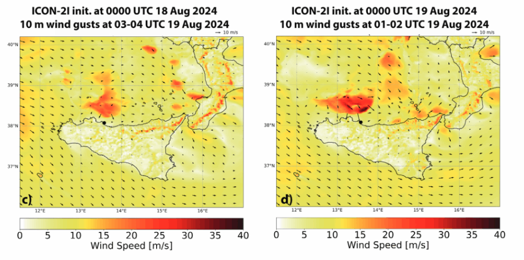 Znanstvenici su analizirali prognoze dva operativna numerička modela: ICON-2I (determinističke prognoze) i ICON-2I-EPS (probabilističke prognoze ansambla). Model ICON-2I, pokrenut 18. kolovoza u 00:00 UTC – punih 26 sati prije potonuća – predvidio je mogućnost jakih udara vjetra između 01:00 i 04:00 UTC 19. kolovoza nad južnim Tirenskim morem.