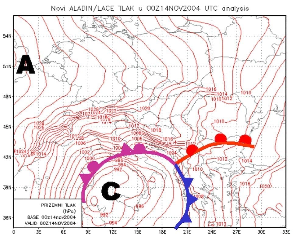 Tadašnja analiza tlaka modelom ALADIN, Državnog hidrometeorološkog zavoda, za 14.11.2004. u 00 UTC, uz docrtane fronte i položaj središta ciklone u Tirenskom moru. Ciklona je još dodatno ojačala tijekom narednih nekoliko sati.