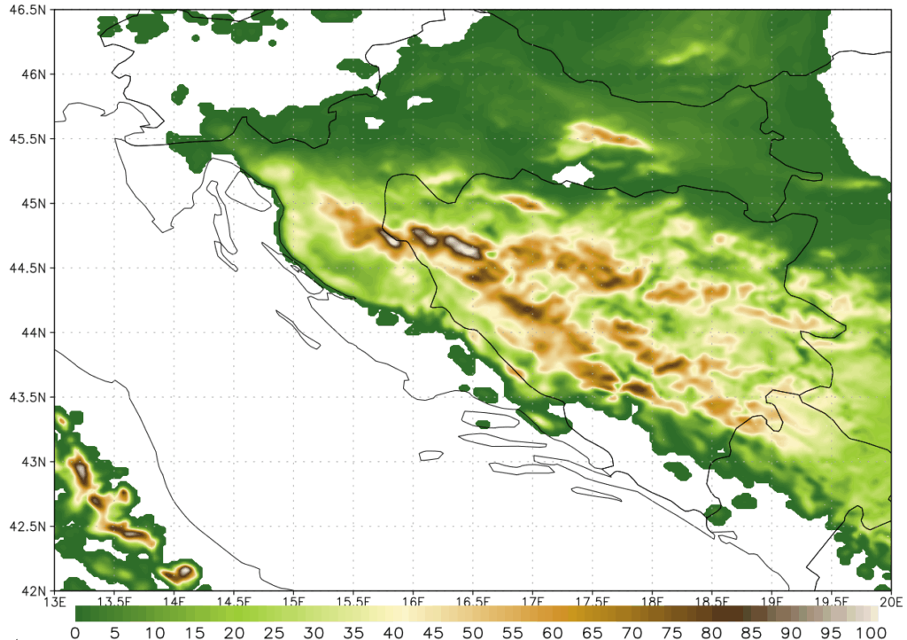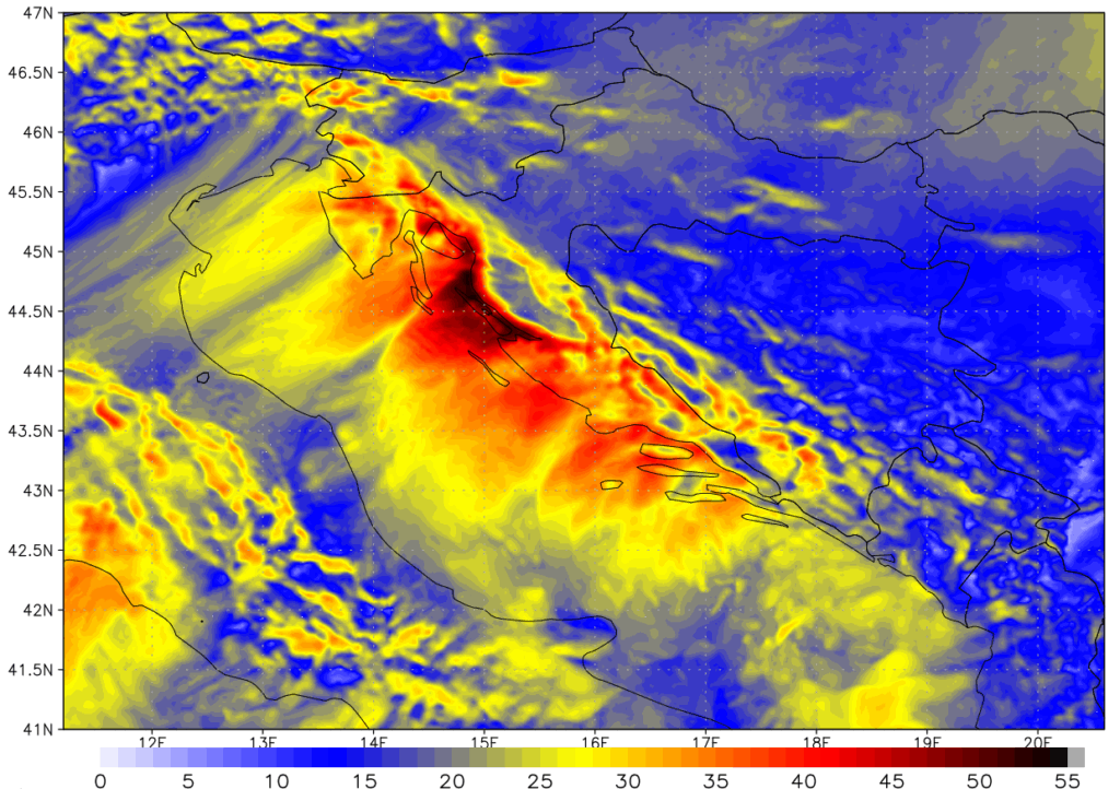 Takva razlika u tlaku stvorila je izniman gradijent preko Dinarida i posljedične orkanske brzine vjetra. Iako tad nisu zabilježeni službeni rekordi brzine vjetra (kao najveća brzina se i dalje vodi onaj iz 21. prosinca 1998. na Masleničkom mostu od 69 m/s), po modelu najveće simulirane brzine udara vjetra oko 55 m/s su doista respektabilne i zaista rijetko se viđaju u operativnoj prognozi ili retro-analizi. Sljedeća slika pokazuje prostorni raspored najvećih brzina udara vjetra od početka do kraja perioda simulacije. Crno sjenčana područja u podvelebitskom području označavaju simulirane brzine od oko 55 m/s, dok crvena boja odgovara brzinama od oko 40 m/s. Uz finiju rezoluciju modela (od korištene 2×2 km), moguće bi bilo detektirati lokalne maksimume koji vjerojatno dosežu i nešto veće brzine.