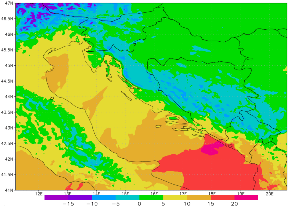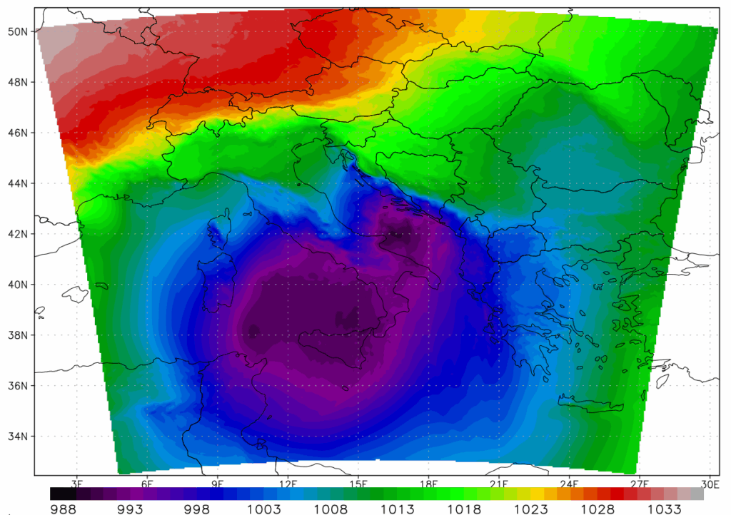 Osim prisjećanja na događaj iskoristili smo priliku i za numeričku simulaciju događaja. Pomoću WRF modela i ulaznih podataka ERA5 reanalize, simulirali smo period od 13. 11. 2004. u 12 UTC do 15. 11. 2004. u 00 UTC, korištenjem dvije ugniježdene domene horizontalne mreže 6 i 2 km. Prema simulacijama, nakon jačanja Tirenske ciklone tijekom noći s 13. na 14. studenog, u jutro 14. studenog u području srednjeg/južnog Jadrana razvilo se je sekundarno središte niskog tlaka. Njemu je najniži tlak, niži i od onog u glavnom vrtlogu u Tirenskom moru, dosegao oko 990 hPa u 7 UTC, što je vidljivo na sljedećoj slici. Razlika tlaka između sjevera Hrvatske (oko 1020 hPa) i područja Palagruže (oko 990 hPa) iznosila je u tom trenutku 30-tak hektopaskala.