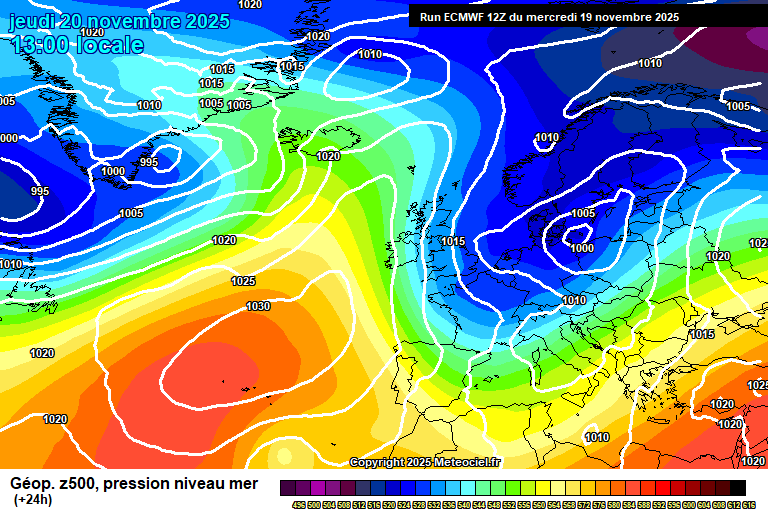 ECMWF model od 19.11. 12 UTC, prognoza tlaka i geopotencijala 500 hPa za 13h, 20.11. Izvor: meteociel.fr