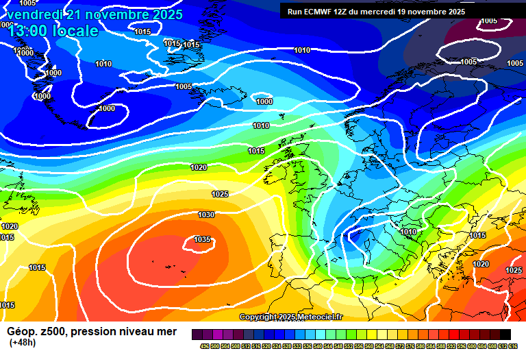 ECMWF model od 19.11. 12 UTC, prognoza tlaka i geopotencijala 500 hPa za 13h, 21.11. Izvor: meteociel.fr