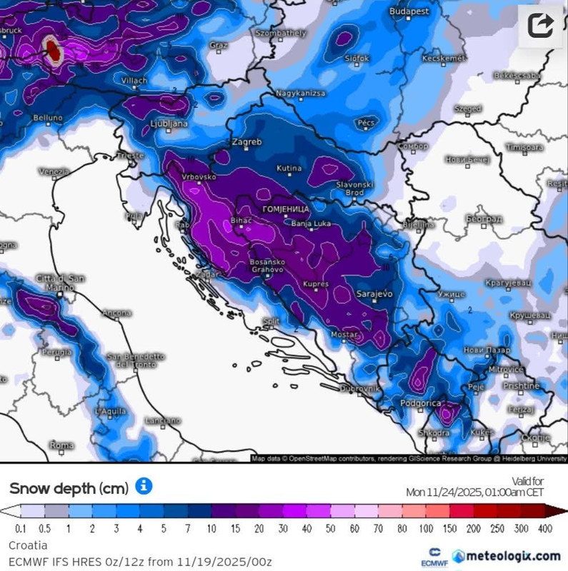 Karta pokazuje prognozirani visinu snježnog pokrivača u regiji, kao proračun ECMWF modela od 19.11. 12 UTC, za noć s nedjelje na ponedjeljak. Izvor: meteologix.com