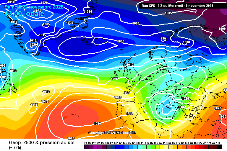 GFS model od 19.11. 12 UTC, prognoza tlaka i geopotencijala 500 hPa za 13h, 22.11. Izvor: meteociel.fr
