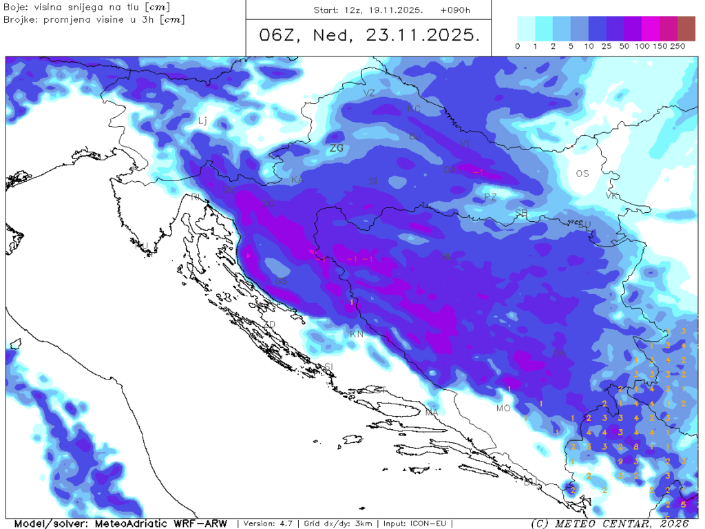 Meteo centrov WRF-ARW model, prognoza temeljena na 19.11. 12 UTC, za nedjelju ujutro. Boje pokazuju prognoziranu visinu snježnog pokrivača.