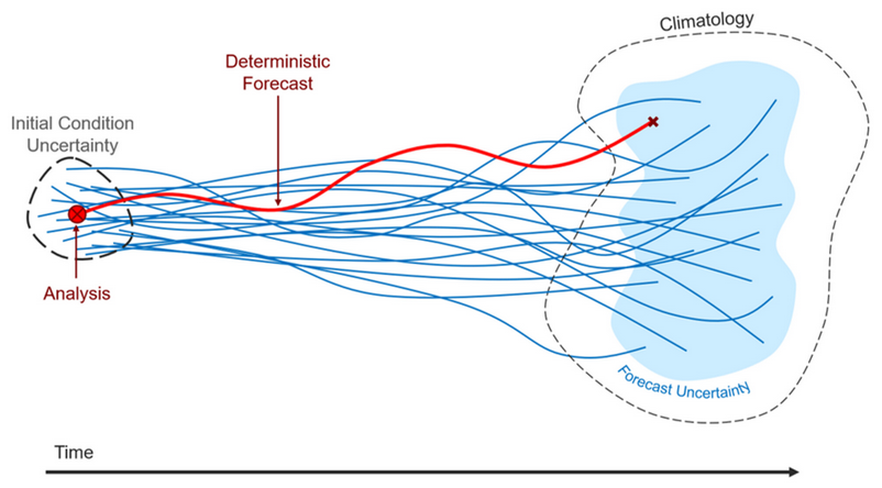 Tradicionalna “deterministička” prognoza polazi od jedne procjene trenutnog stanja atmosfere i simulira jedan mogući razvoj događaja. Problem je što takva prognoza ne govori ništa o tome koliko smo sigurni u taj ishod.