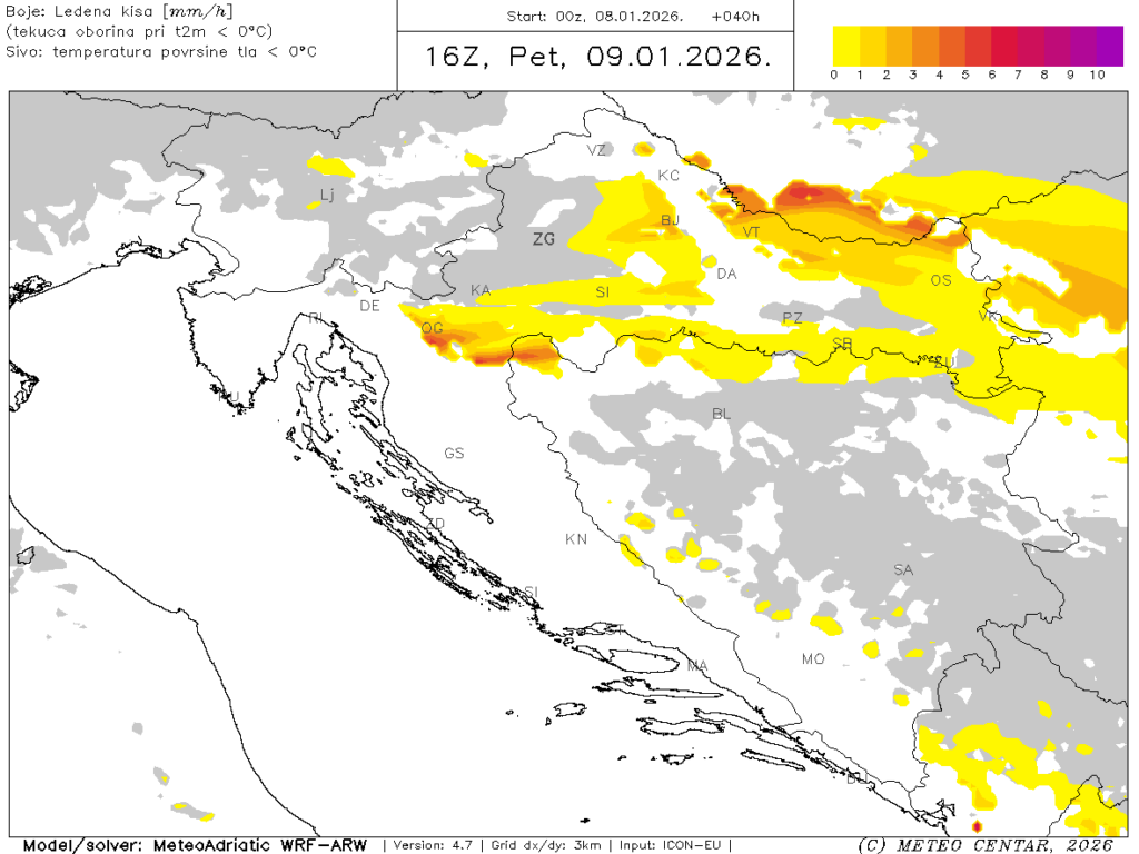 Na slici je prikazan samo jedan od trenutaka (17 sati po lokalnom vremenu) gdje žuto-crveno obojana područja prikazuju prognoziranu ledenu kišu. Ona je moguća u cijelom nizinskom području unutrašnjosti gdje će se topao zrak koji dolazi u višim slojevima najteže probiti do tla.