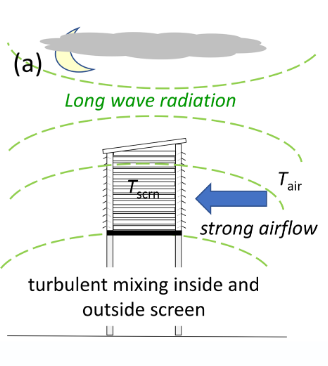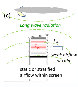 Slika (c) prikazuje situaciju kad Stevensonov zaklon dovodi do precjenjivanja minimalne noćne temperature. Ponovo imamo situaciju sa slabim vjetrom, ali sad se umjesto vedrog neba, bilježi naoblaka. Poznato je da oblaci stvaraju protuzračenje, odnosno vraćaju velik dio izračene energije s tla natrag i time onemogućavaju efektno hlađenje površine. Stijenke zaklona ostaju toplije i precjenjuju noćnu temperaturu zraka.