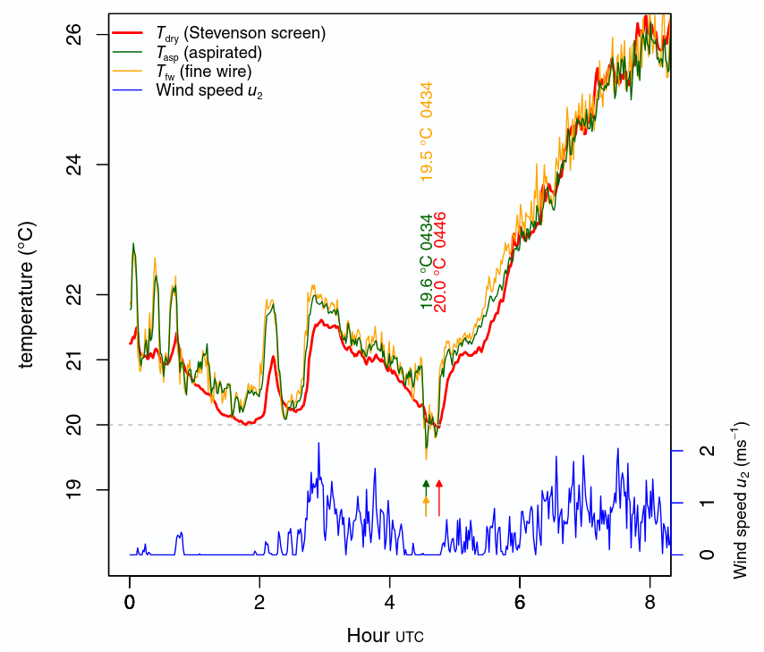 Finožični termometar, koji reagira gotovo trenutno na promjene temperature, zabilježio je kratki “impuls” hlađenja oko 4:34 ujutro. Aspirirani termometar, s prisilnom ventilacijom, također je taj impuls registrirao. No termometar u Stevensonovu zaklonu, bez dovoljne prirodne ventilacije, nije stigao reagirati na taj kratki pad temperature – njegova termalna inercija “zagladila” je fluktuaciju.