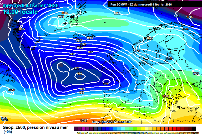 Sinoptička karta vrlo izraženih ciklonalnih aktivnosti koje su se protezale od Atlantskog oceana i obuhvatile veliki dio srednje i južne Europe, 04.veljače u 12h. Izvor: Meteociel