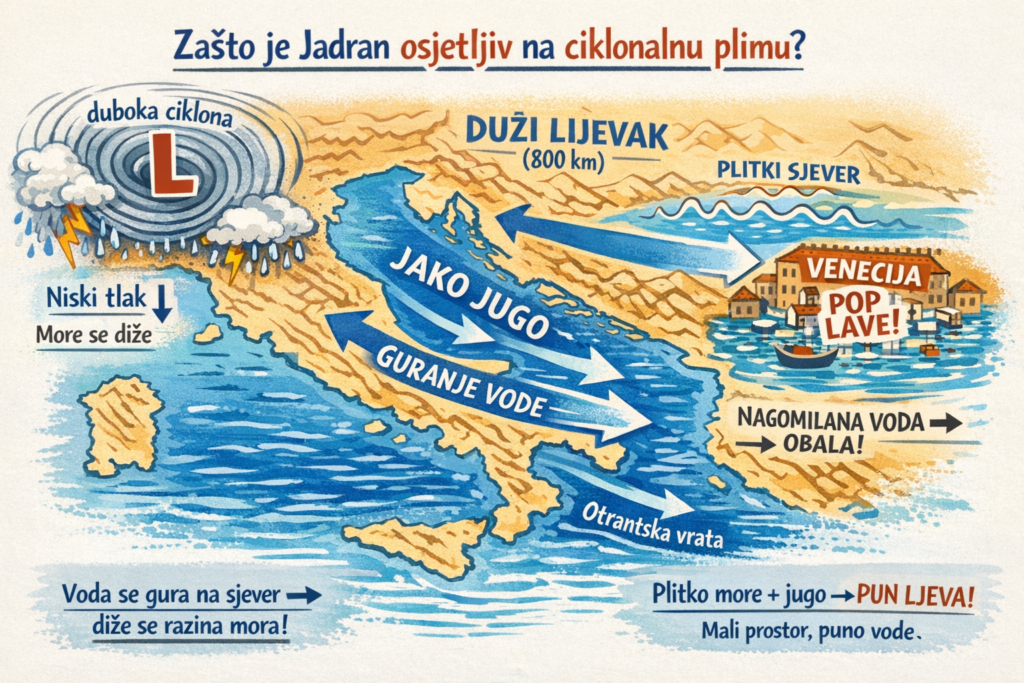 Jadran je posebno osjetljiv na ciklonalne plime, jer je sa svojih 800km dužine otvoren samo prema jugu. Jaki južni vjetrovi podižu valove i guraju vodu od juga prema sjeveru. Voda nema kamo i stvara se tzv, “efekat lijevka”. Uz to, sjeverni Jadran je relativno plitak i specifične konfiguracije morskog dna, šta još više pridonosi podizanju vode i stradavanju gradova uz more, tj gradskim obalnim dijelovima (npr. Venecija).