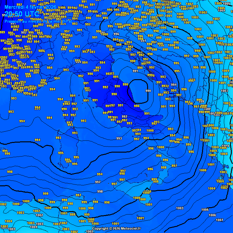 Karta izobara i vrijednosti tlaka zraka, ulaskom ciklone u Jadran oko 20h, istog dana. Izvor: Meteociel