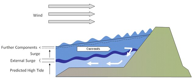 Vjetar je drugi veliki igrač u ovoj priči, i često važniji od samog tlaka. Dok tlak djeluje kao vertikalni pritisak na morsku površinu, vjetar gura more horizontalno — proizvodi takozvani vjetreni nanos (engleski wind setup ili wind surge).