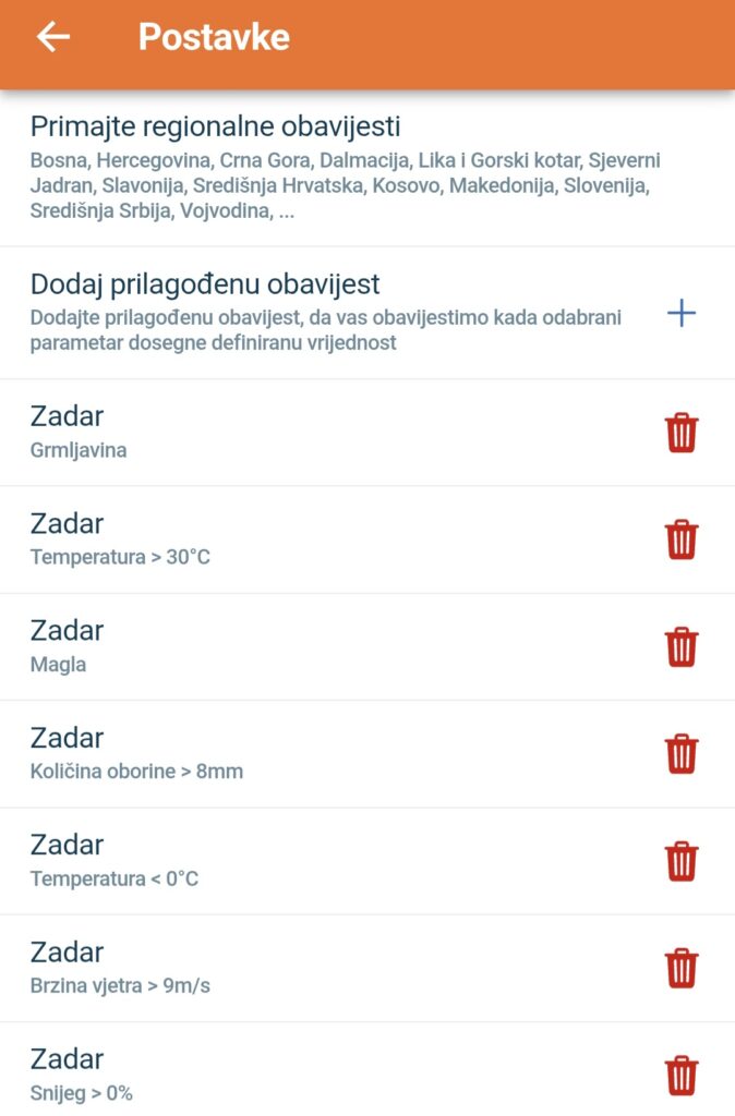 Svaki put kad se pojavi zadovoljen neki od uvjeta u prognozi, pojavit će se notifikacija, a uvjet koji je zadovoljen bit će trajno prikazan u Obavijestima, dok god je aktivan. Ako ga nova prognoza poništi, izbrisat će se iz Obavijesti. Mogućnosti za konfiguriranje ovih uvjeta su beskrajne, a u novim verzijama aplikacije bit će dodana nova poboljšanja ove funkcije, koja nismo stigli isprogramirati za inicijalnu verziju.
